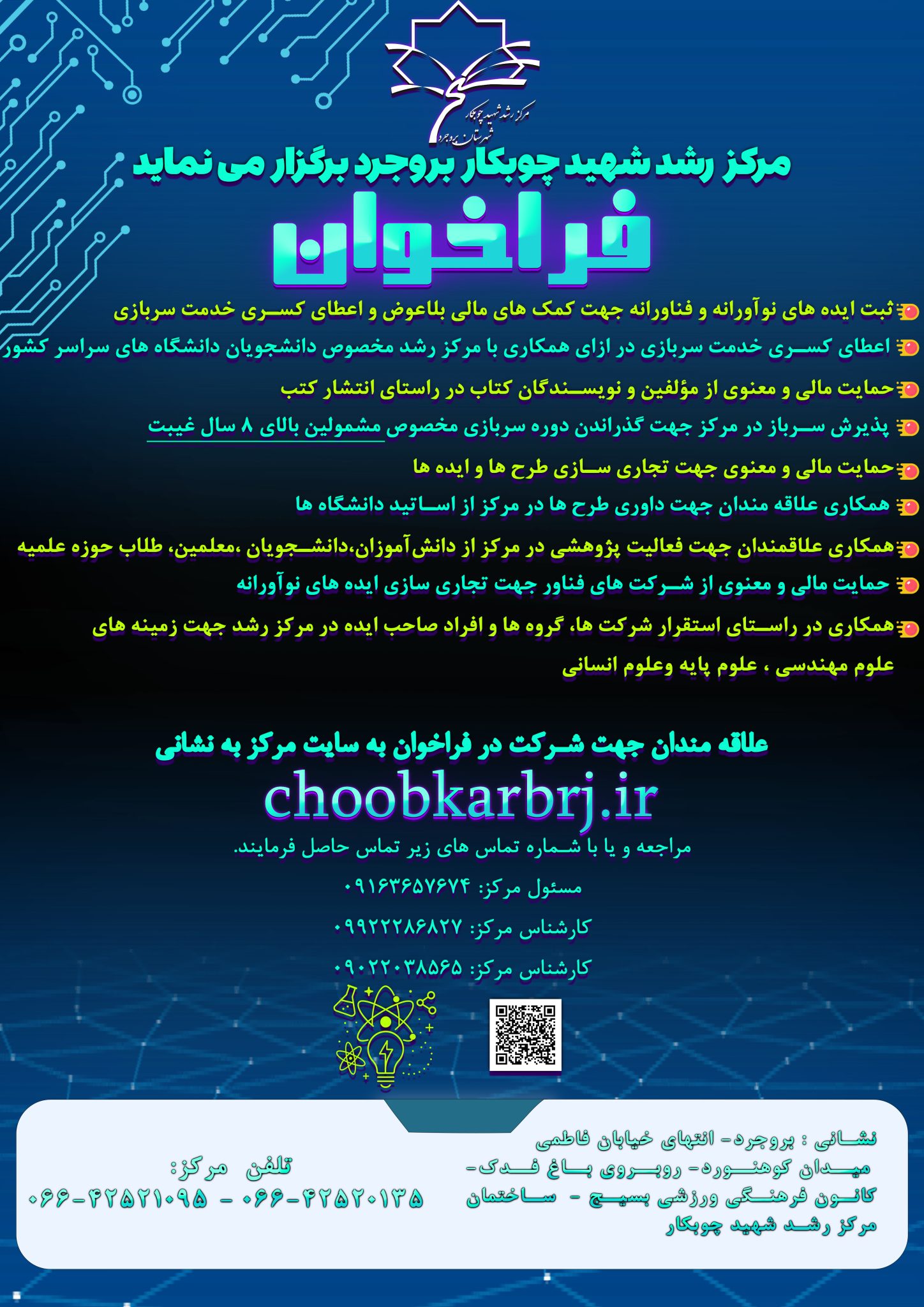 مرکز رشد شهید چوبکار که یک مرکز علمی_تحقیقاتی_جهادی است در نظر دارد جهت تکمیل و توسعه برنامه های علمی ،آموزشی و تحقیقاتی و ماموریت های محوله خود از افراد و علاقه مندان متخصص و دارای پشتکار و با روحیه های علمی، تحقیقاتی و آموزشی از قشرهای مختلف اعم از استادان دانشگاه ، دانشجویان ، شرکت های دانش بنیان و عموم علاقه مندان دعوت به عمل بیاورد.