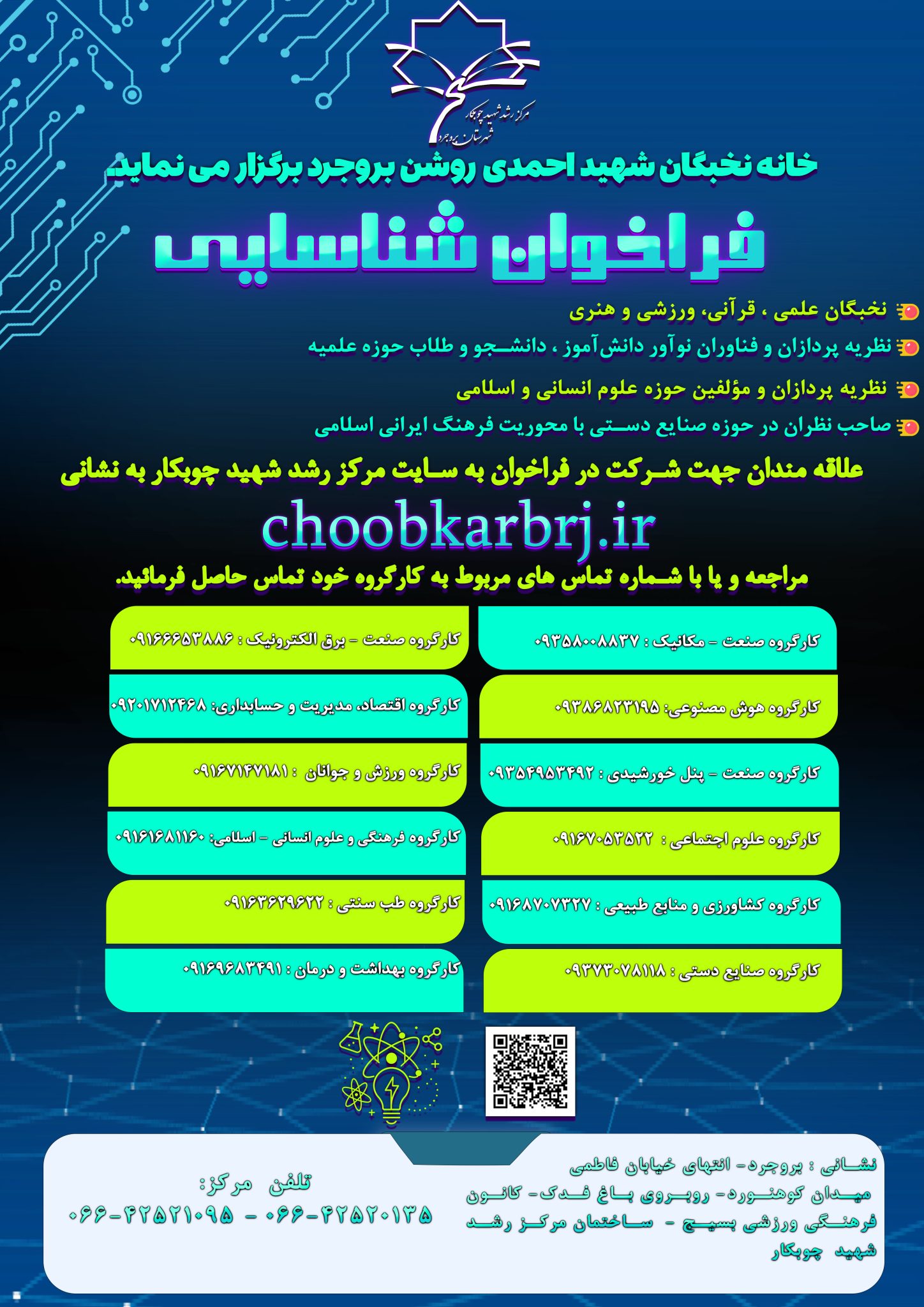 مرکز رشد شهید چوبکار شهرستان بروجرد، در نظر دارد در قالب کار گروه های مختلف فنی ، علوم پایه و انسانی طرح ها ، ایده ها و خلاقیت های نخبگان عزیز بروجردی شناسایی و از آنها حمایت های مادی و معنوی به عمل بیاورد و نخبگان ، صاحبین ایده میتوانند از طریق ارتباط از راه های مجازی و حضوری در مرکز، طرح ها و ایده های خود در کار گروه های مرکز رشد شهید چوبکار ثبت کنند.